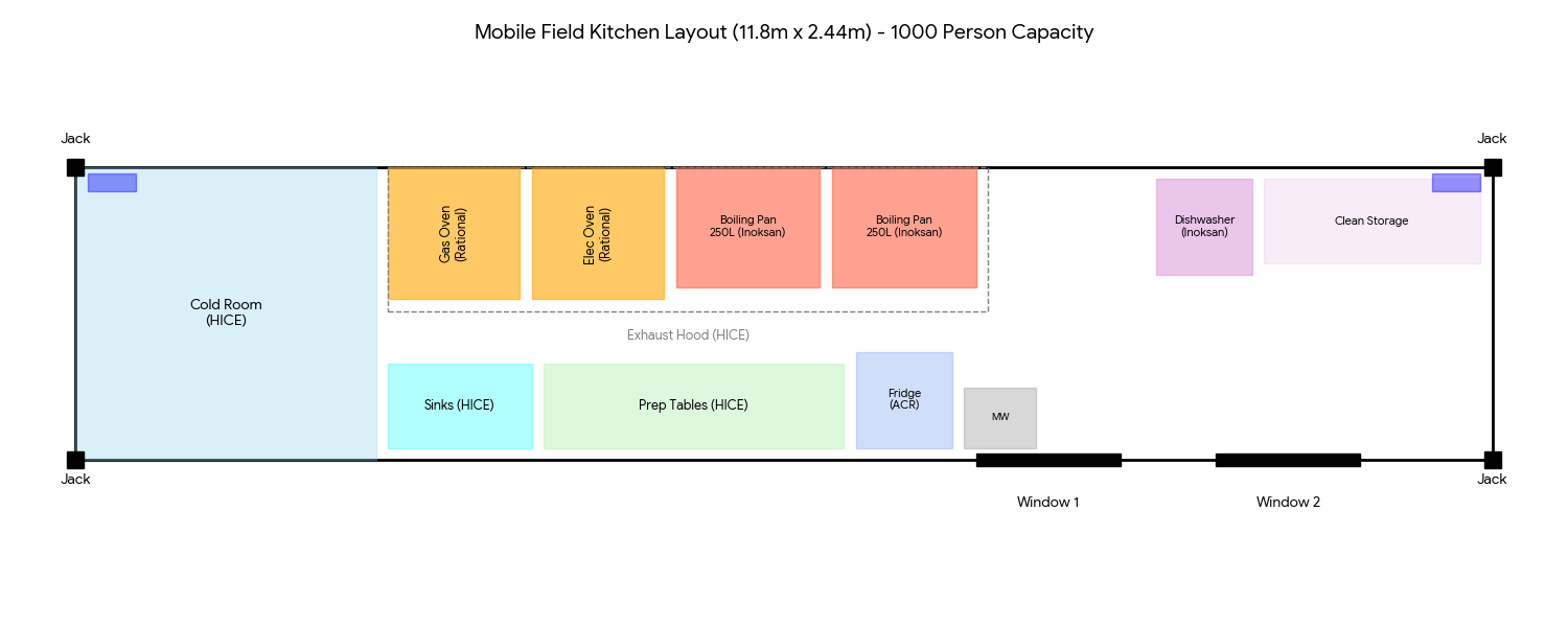 مطبخ ميداني متكامل داخل حاوية شحن بنظام High Cube، قادر على خدمة 1,000 شخص يومياً