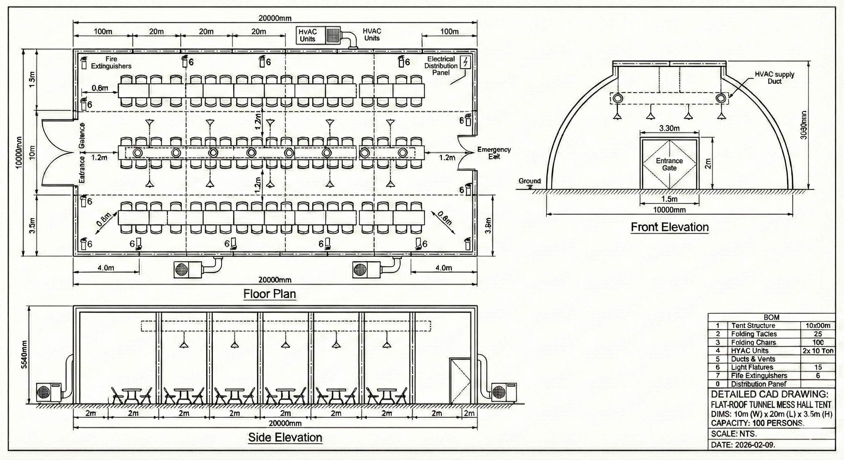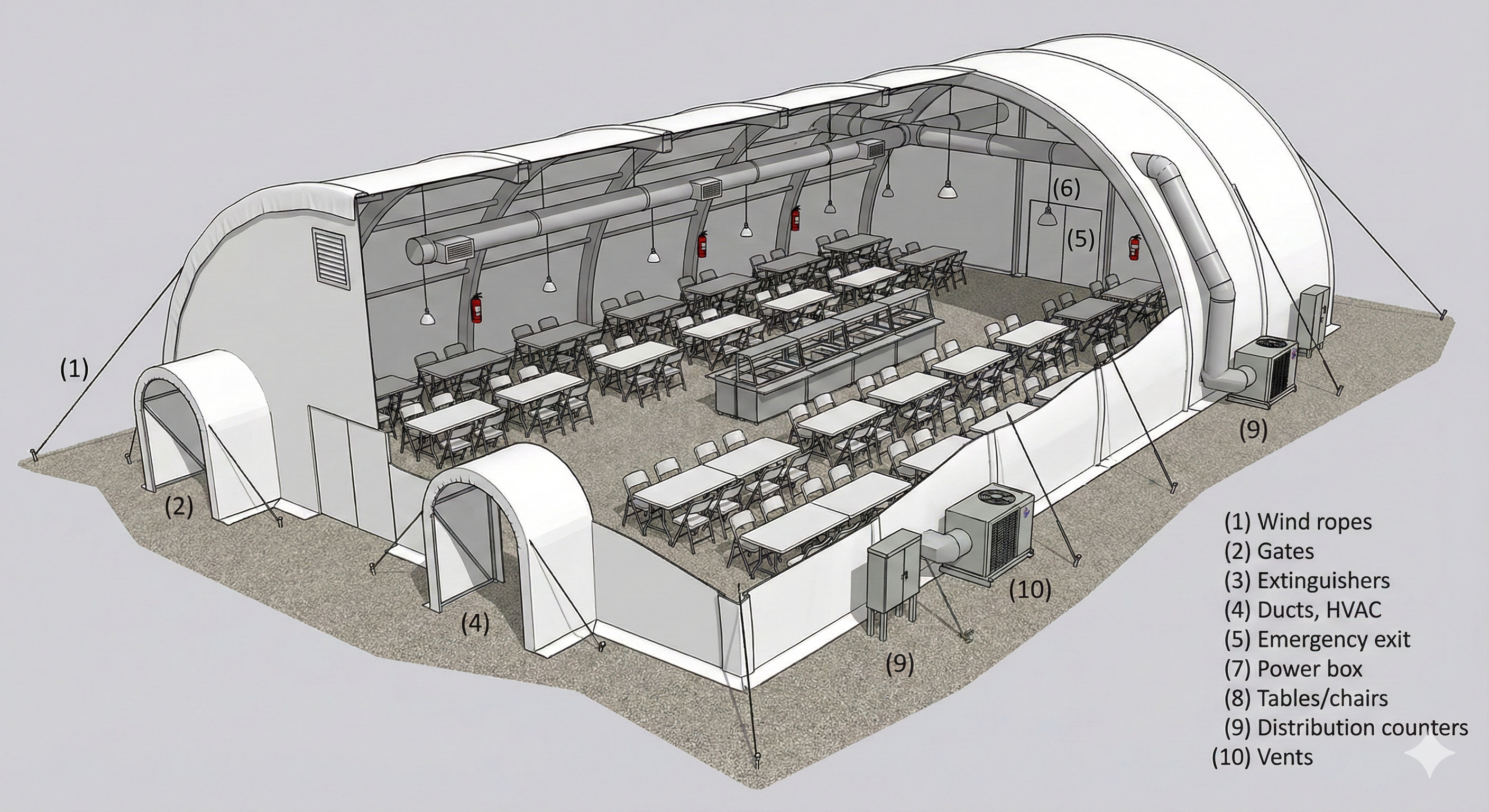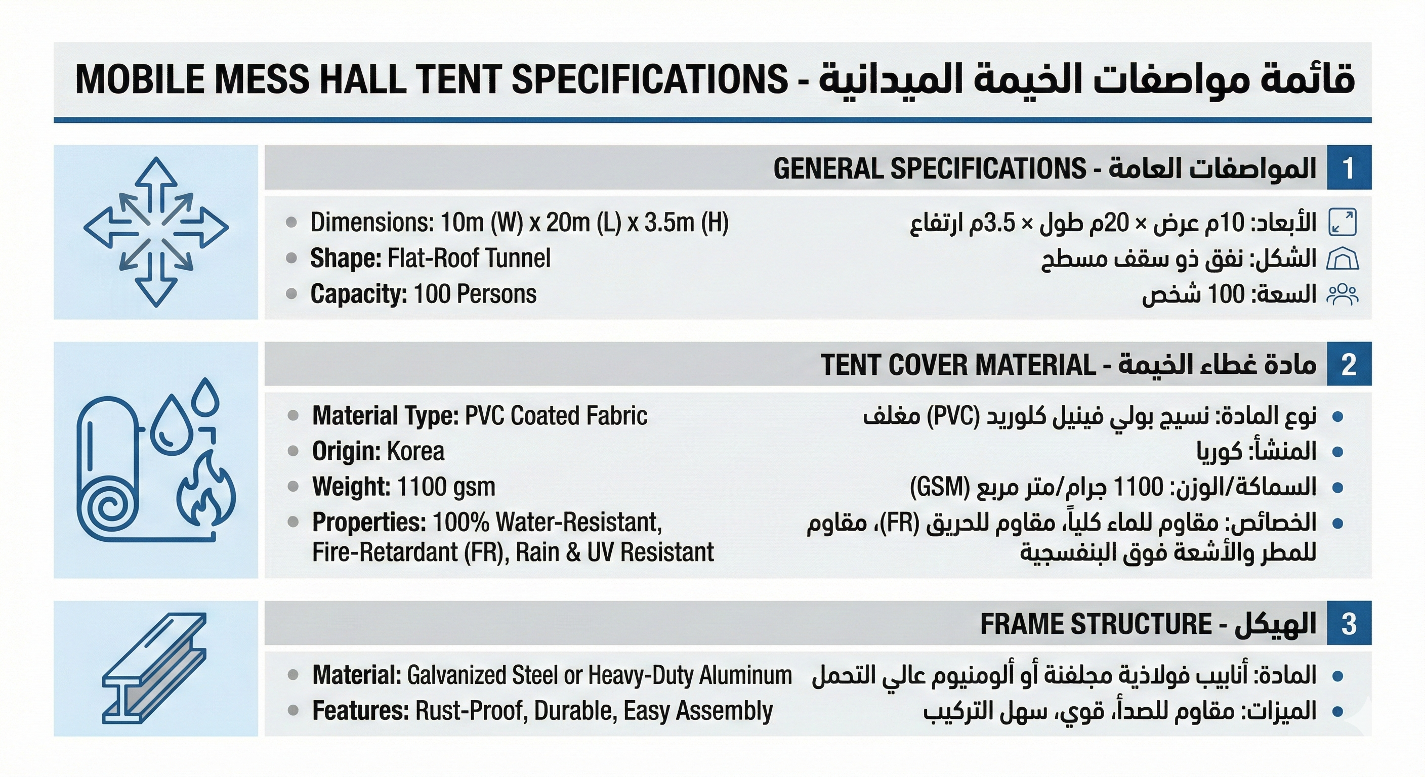 وحدة المطعم المتنقلة بمساحة 200 متر مربع، مصممة بتقنية النفق المطور مع نسيج PVC كوري مقاوم للحريق والأشعة فوق البنفسجية، تستوعب من 100 إلى 400 شخص.