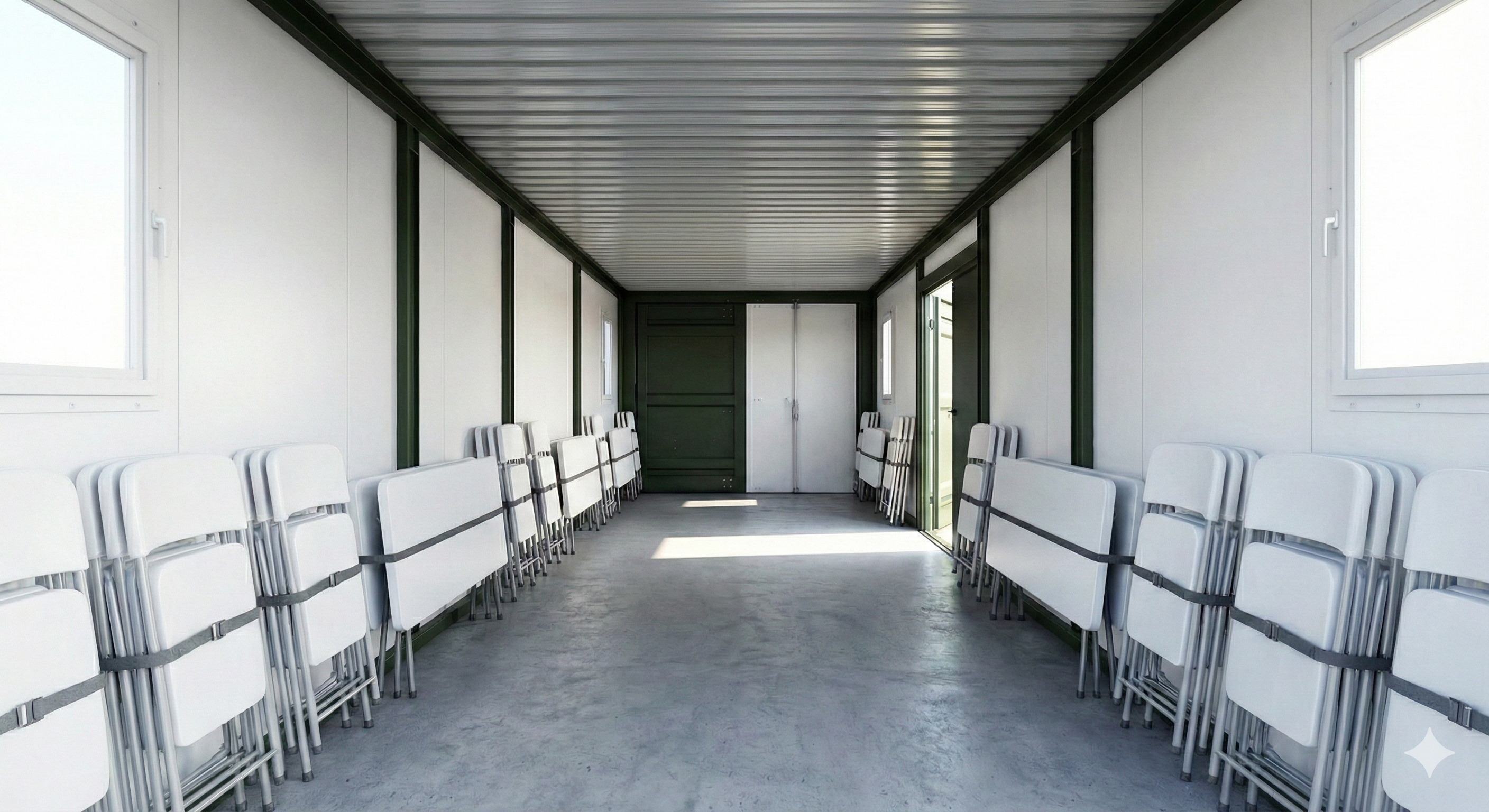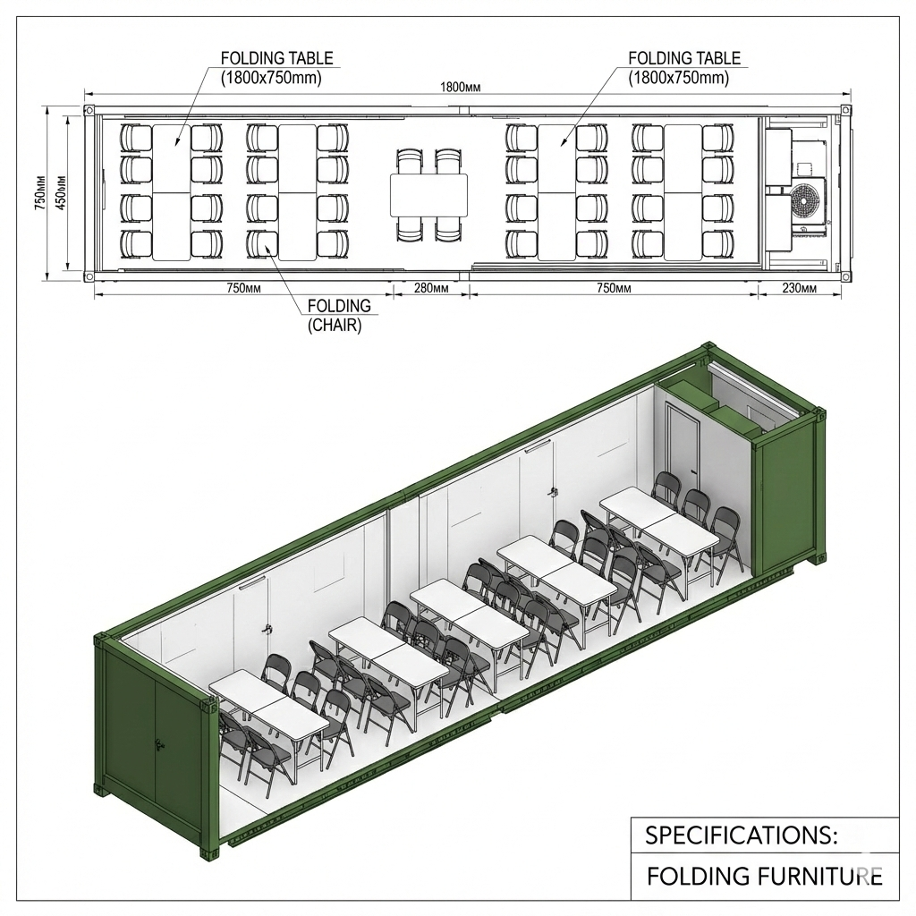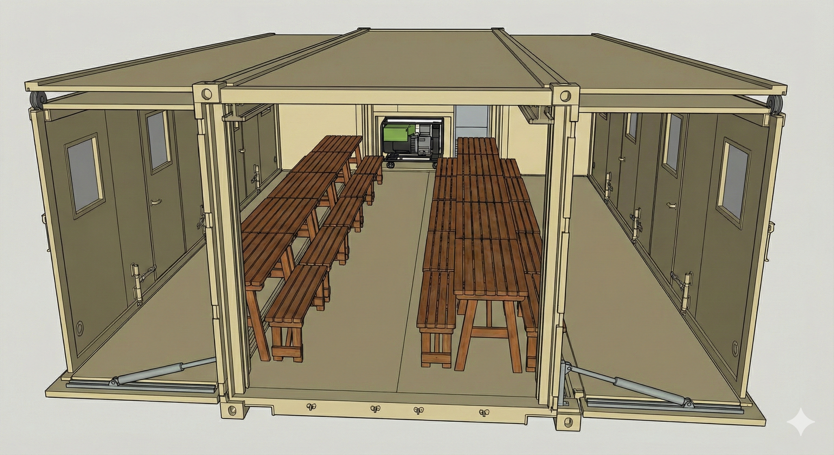 حاوية ISO معدّلة بنظام التوسع الهيدروليكي المزدوج، تتحول من حاوية شحن قياسية إلى صالة واسعة بعرض 7.5 متر ومساحة 85 متر مربع تسع حتى 200 فرد.